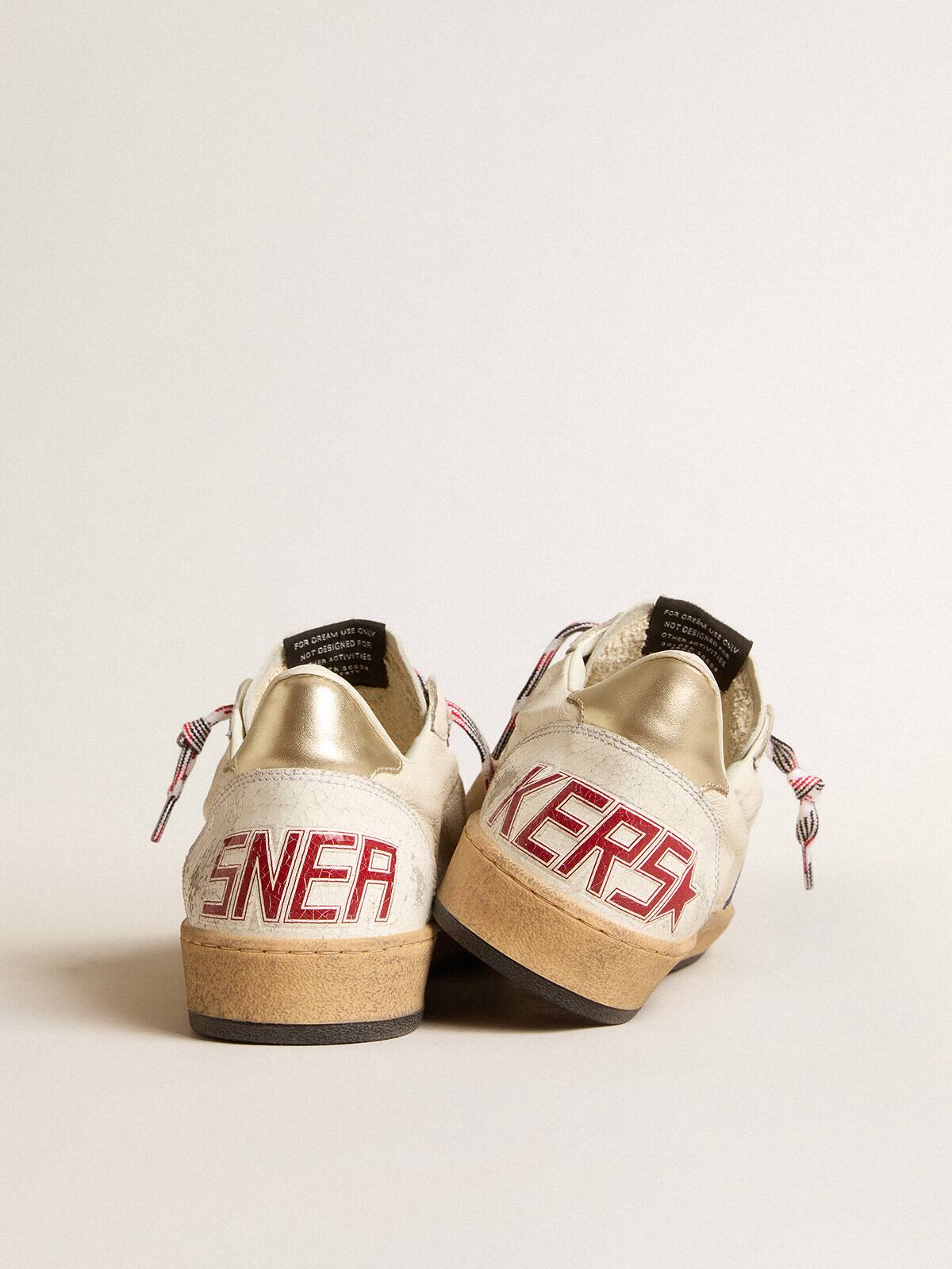 Soñando con los años ochenta. Nuestras zapatillas Ball Star tienen una vibra de universidad americana atrapada entre un tiro de aro y un paseo en patineta. Este modelo con parte superior de cuero nappa blanco presenta una estrella de ante azul y una lengüeta de talón de cuero metálico color platino. Los insertos de cuero agrietado blanco y los cordones blancos con estampado de rayas rojas y negras añaden el toque final: cosas hermosas que nunca pasan de moda.