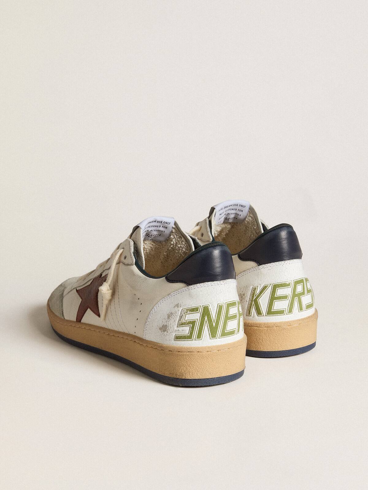 Soñando con los años ochenta. Nuestras zapatillas Ball Star tienen una vibra de universidad americana atrapada entre un tiro de baloncesto y un paseo en patineta. Este modelo con un upper de cuero nappa blanco presenta una estrella de nobuk marrón y una lengüeta de talón de cuero nappa azul oscuro. La puntera en ante gris hielo, el inserto en la parte posterior en cuero blanco craquelado y los cordones color crema añaden el toque final: cosas hermosas que nunca pasan de moda.