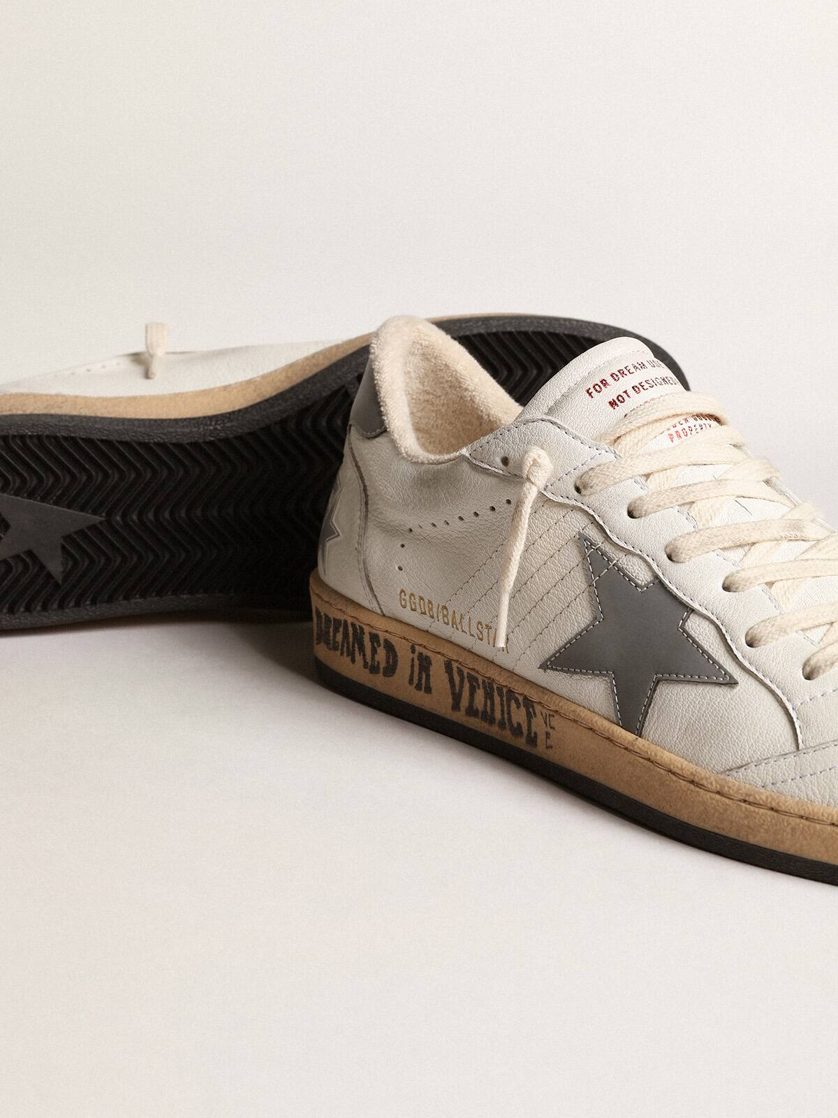Soñando con los años ochenta. Nuestras zapatillas Ball Star tienen un ambiente universitario americano y una sensación de la escena del baloncesto de la época. Este modelo con un upper de cuero nappa blanco presenta una estrella y una lengüeta en el talón de nylon reflectante gris. La letra contrastante "Dreamed in Venice" en el foxing, la suela gris y los cordones color crema añaden el toque final: cosas hermosas que nunca pasan de moda.