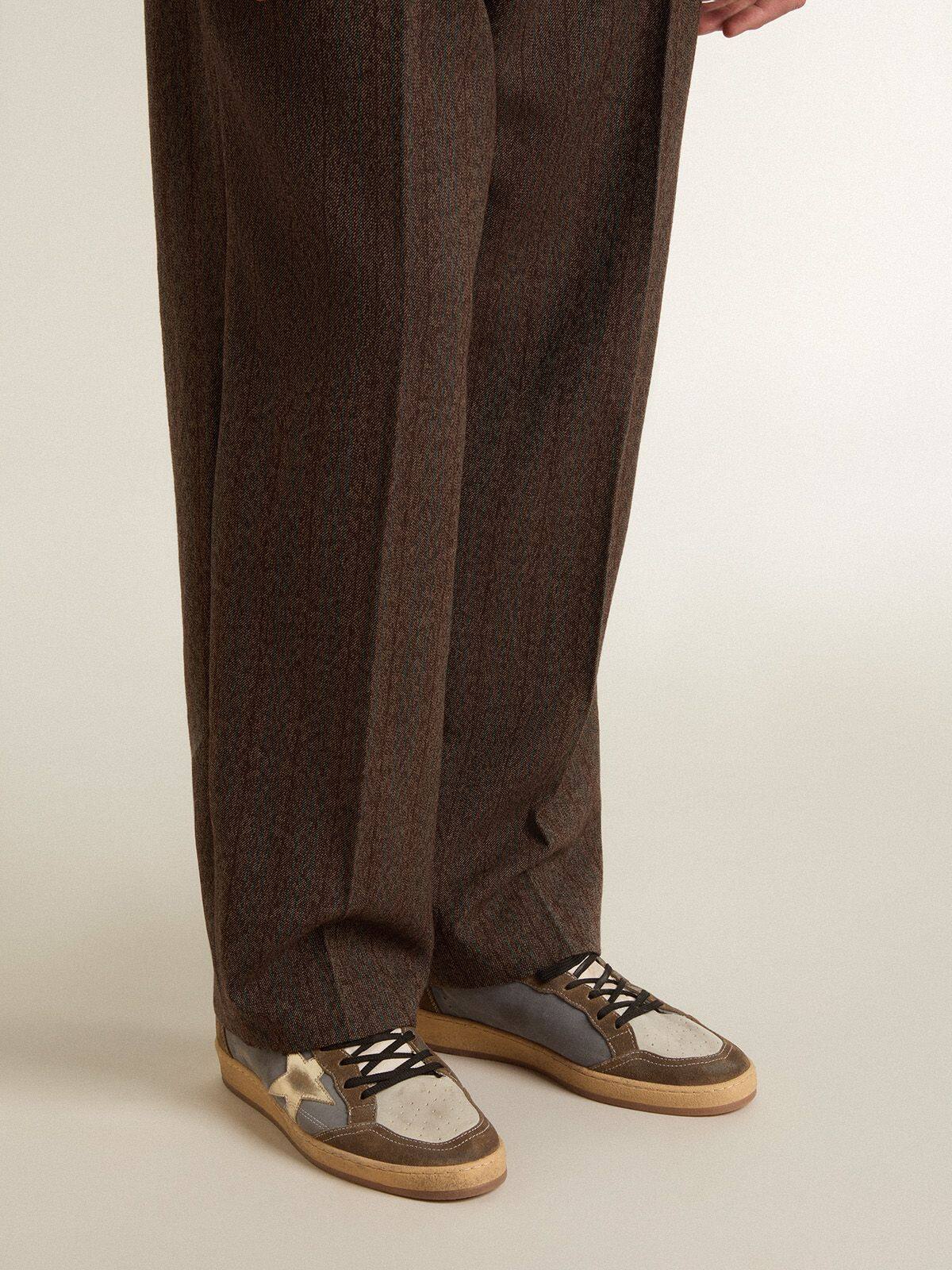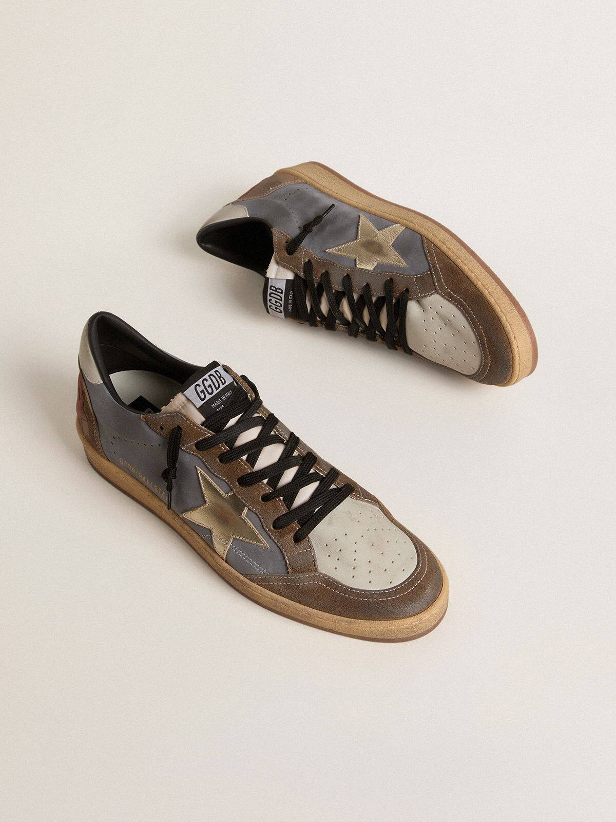 Soñando con los años ochenta. Nuestras zapatillas Ball Star tienen una vibra de universidad americana atrapada entre un tiro de baloncesto y un paseo en patineta. Este modelo para hombres presenta un upper de nobuk gris y gamuza marrón con un efecto vintage, acentuado con una estrella de cuero metálico dorado y una lengüeta de cuero blanca en el talón. Los cordones negros y el acabado vintage añaden un atractivo atemporal al look. Las cosas bellas nunca pasan de moda.
