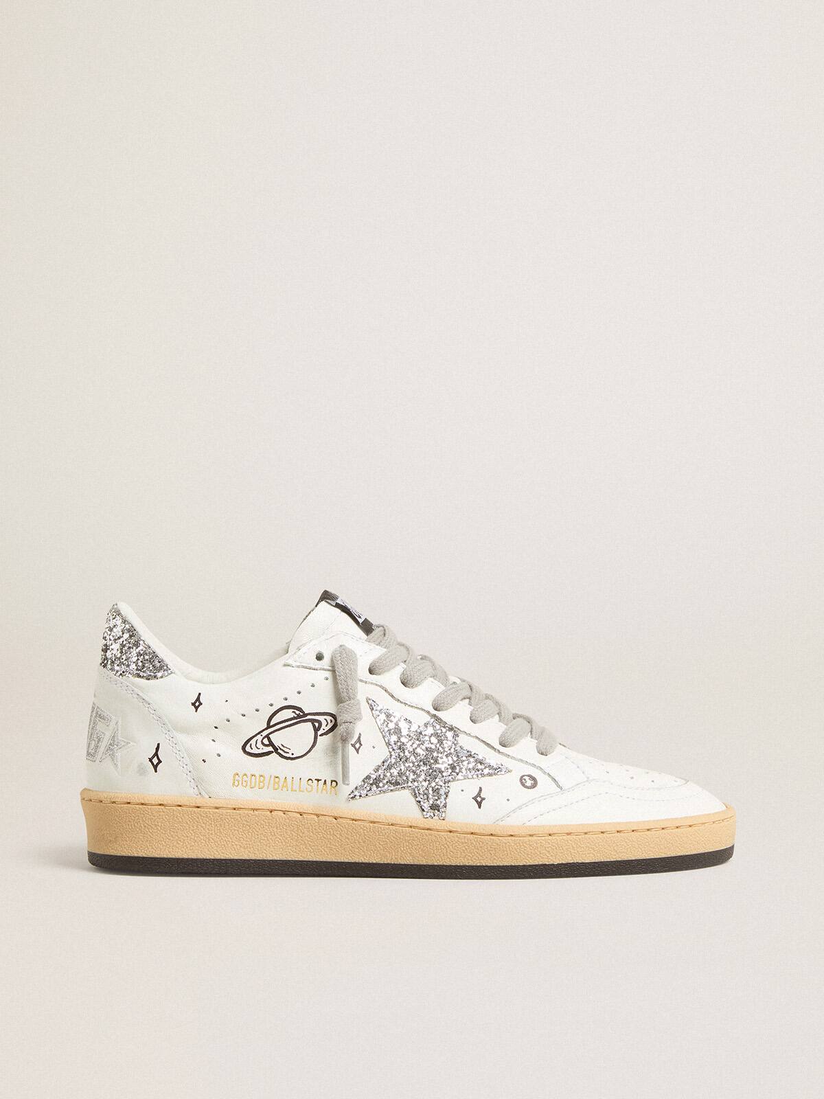 Inspirado en la atmósfera universitaria americana de los años 80, este Ball Star presenta la frase Dreaming en purpurina plateada en el talón. Este modelo para hombres, con una parte superior de cuero nappa blanco, se destaca por su estrella plateada y detalles de cuero craquelado blanco, como la puntera y el inserto en la parte trasera.
