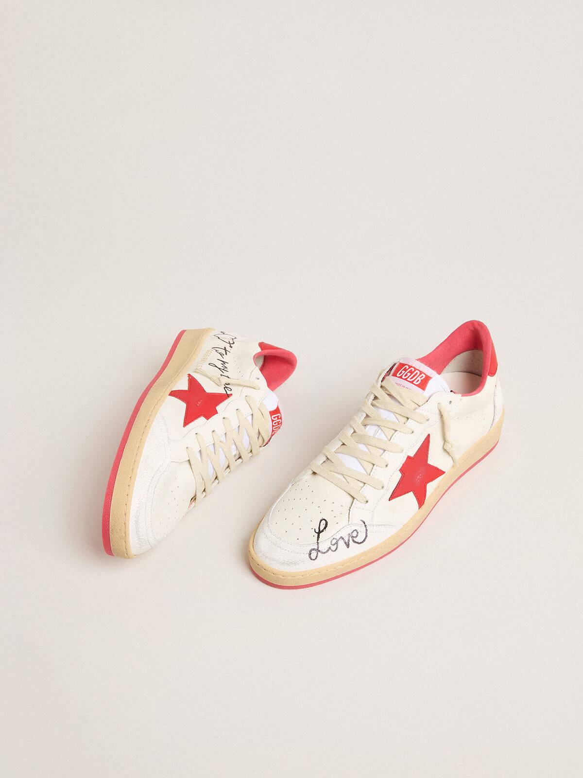 Inspirado en la atmósfera universitaria americana de los años 80, este Ball Star presenta la frase Love You en rojo en el talón. Este modelo para hombres, con un upper de napa blanca, se destaca por su estrella de cuero laminado rojo y detalles de cuero craquelado blanco, como la puntera y el inserto en la parte trasera.