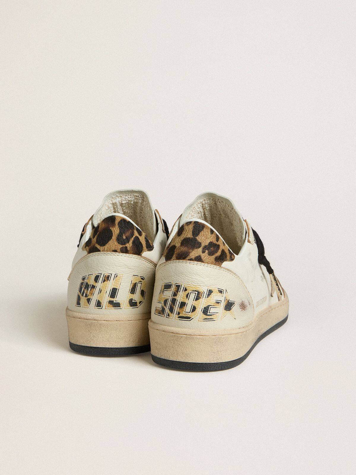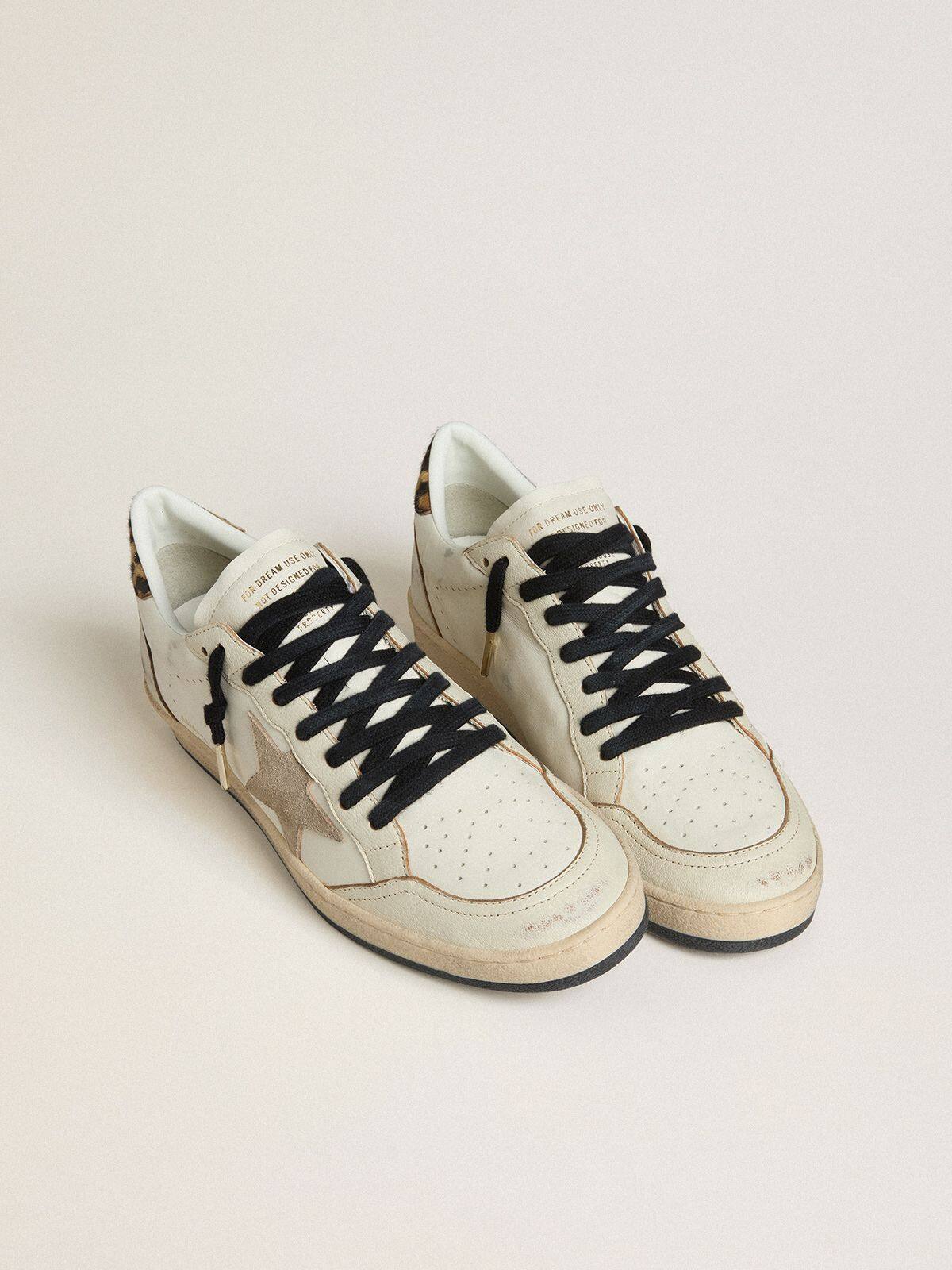 Inspirado en la atmósfera universitaria americana de los años 80, este modelo para hombres con parte superior de cuero blanco presenta una estrella de ante beige y una lengüeta de piel de pony en estampado de leopardo beige y marrón. La puntera de cuero napa blanco y el inserto en la parte trasera y los cordones negros añaden el toque final: cosas hermosas que nunca pasan de moda.