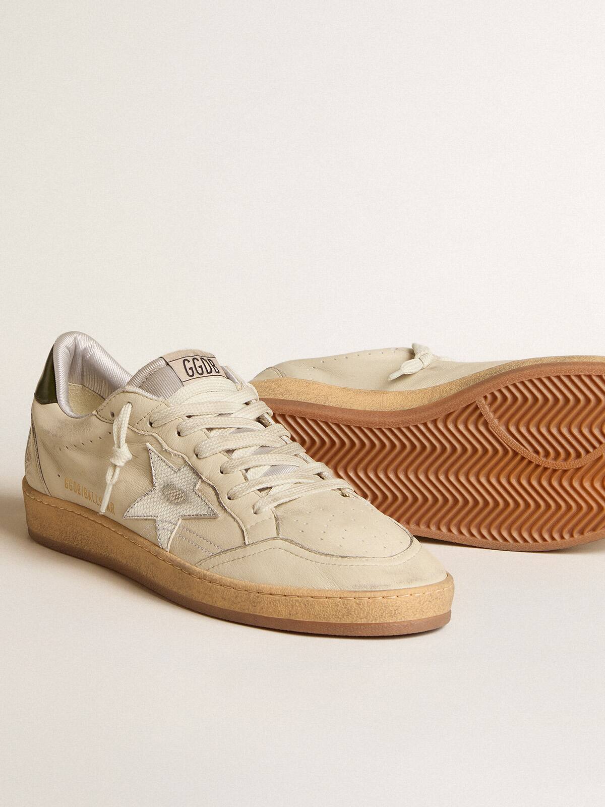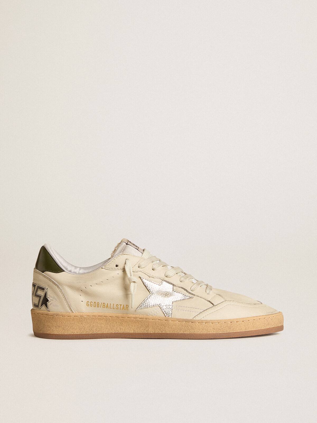 Soñando con los años ochenta. Nuestras zapatillas Ball Star tienen una vibra de universidad americana atrapada entre un tiro de baloncesto y un paseo en patineta. Este modelo con una parte superior de cuero blanco desgastado presenta una estrella de cuero metálico plateado con un estampado de reptil y una lengüeta de talón de cuero verde. La lengüeta de nailon gris mármol y los cordones blancos desgastados añaden el toque final: cosas hermosas que nunca pasan de moda.