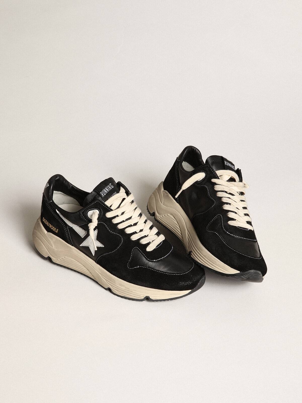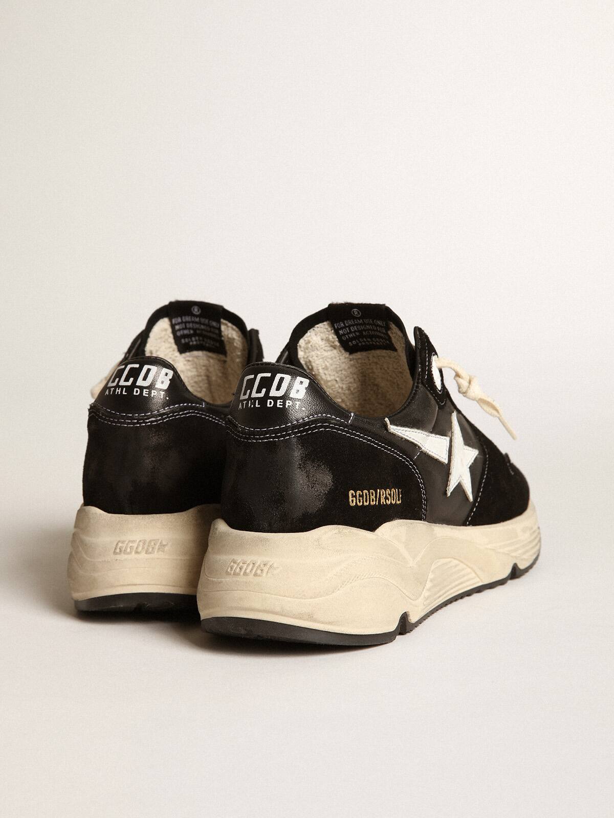 Estilo urbano y un espíritu de artesanía se combinan en nuestras zapatillas Running Sole: el compañero ideal para tus aventuras metropolitanas. Este modelo para hombres presenta una parte superior de cuero nappa negro y ante con una estrella de cuero blanca y una lengüeta de talón de cuero nappa negro. Y los cordones blancos añaden el toque final.