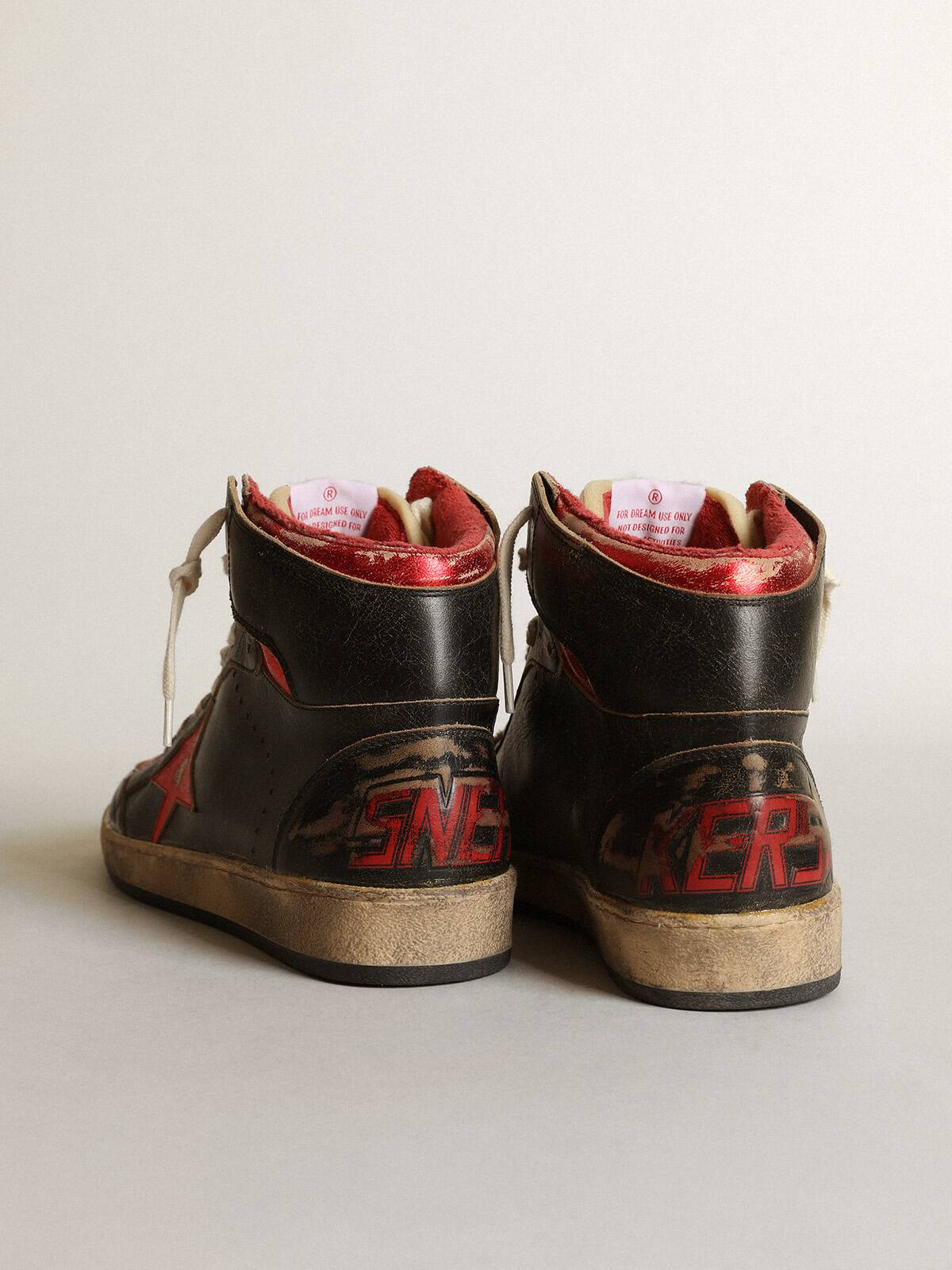 Una reinterpretación de las zapatillas altas con un alma auténtica: inspiradas en nuestro modelo Ball Star, nuestras zapatillas Sky-Star tienen una vibra de universidad americana y una sensación de la escena del baloncesto de los años ochenta. Este modelo para hombres, con una parte superior de cuero negro brillante con efecto desgastado, presenta una estrella de cuero metálico rojo y una lengüeta en el talón, y la firma de Golden Goose en el cuello del tobillo, una referencia al sueño de la infancia de tener tus zapatillas favoritas firmadas por leyendas del baloncesto. La puntera de cuero metálico rojo, la lengüeta de nailon y los cordones de color crema completan el look.