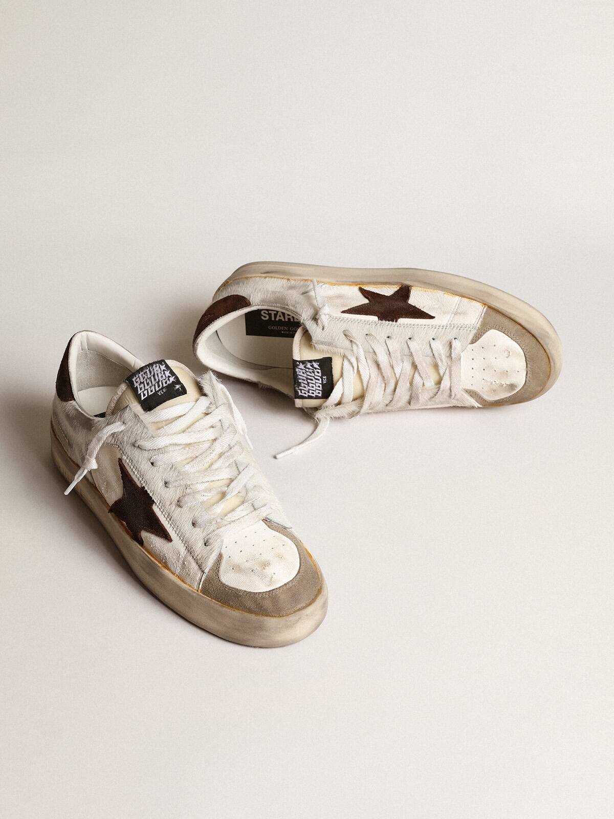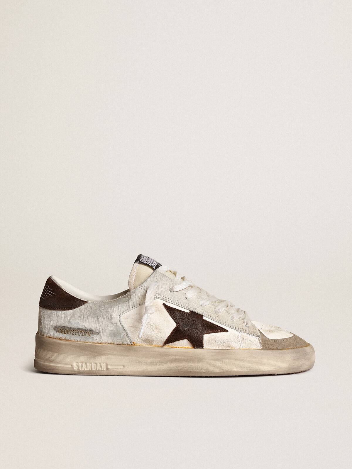 Las gloriosas décadas de los noventa envueltas en una zapatilla. Las zapatillas Stardan rinden homenaje a los íconos del baloncesto de esa década, mientras mantienen un ojo en el presente. En esta versión para hombres, la parte superior de cuero nappa color crema acentuada con inserciones de piel de pony blanca presenta una estrella de ante marrón y una lengüeta en el talón. La puntera de ante gris paloma y los cordones blancos añaden el toque final.