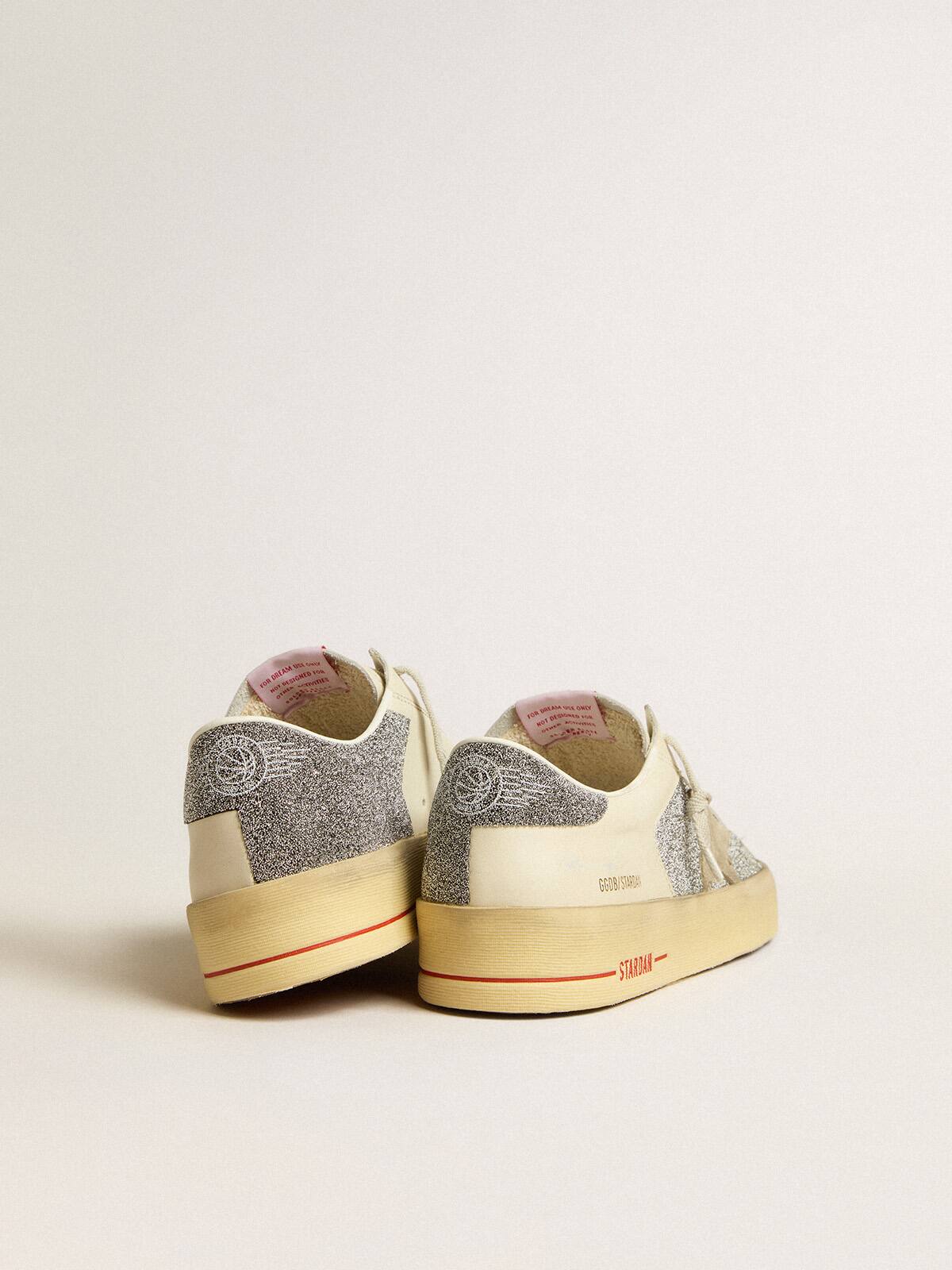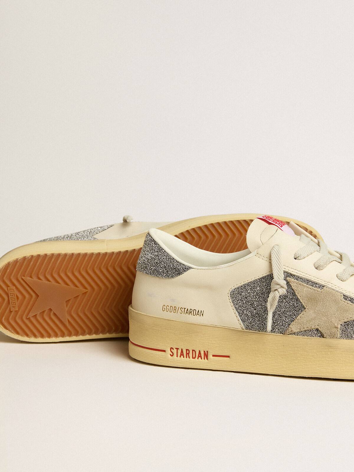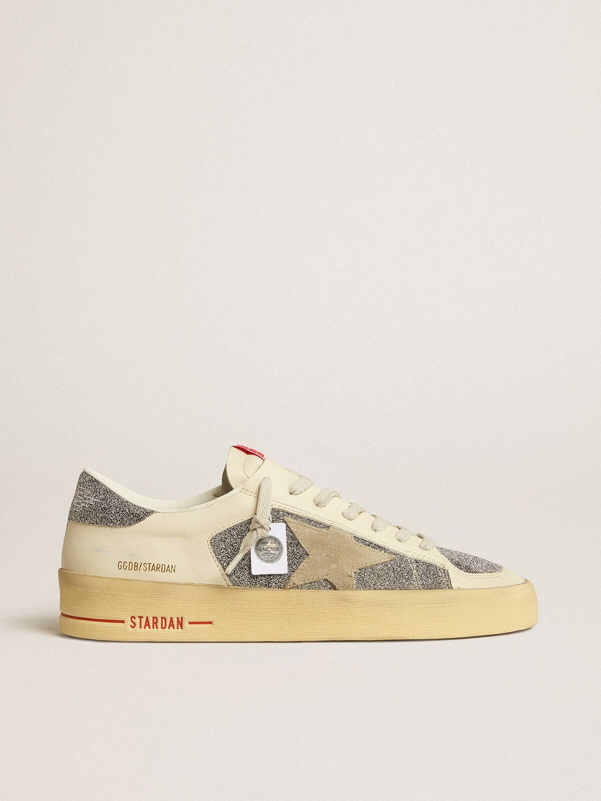 Las gloriosas décadas de los noventa envueltas en una zapatilla. Las zapatillas Stardan rinden homenaje a los íconos del baloncesto de esa década, mientras mantienen un ojo en el presente. Esta versión para hombres, con una parte superior de ante color blanco roto iluminada con micro-cristales Swarovski plateados, presenta una estrella de ante color arena y una lengüeta de talón con micro-cristales Swarovski plateados. El inserto asimétrico en la parte posterior adornado con micro-cristales Swarovski plateados y cordones blancos añaden el toque final.