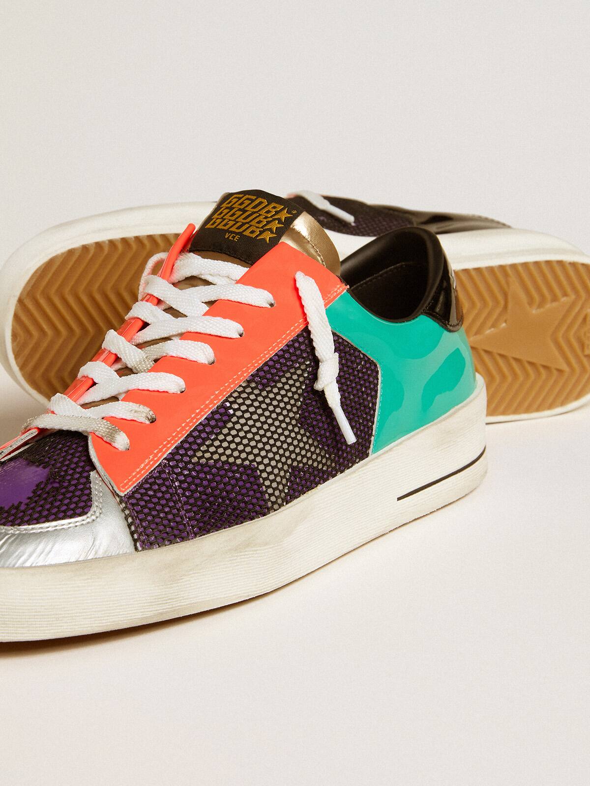 Las gloriosas décadas de los noventa envueltas en una zapatilla. Las zapatillas Stardan rinden homenaje a los íconos del baloncesto de esa década, mientras mantienen un ojo en el presente. Con un upper de malla negra y cuero charol en tonos de negro, verde y púrpura, esta versión para hombres presenta una estrella de goma transparente y una lengüeta de talón de cuero charol negro. Los insertos de cuero charol naranja, la puntera de cuero plateado, la lengüeta de cuero metálico dorado y los cordones blancos añaden el toque final.
