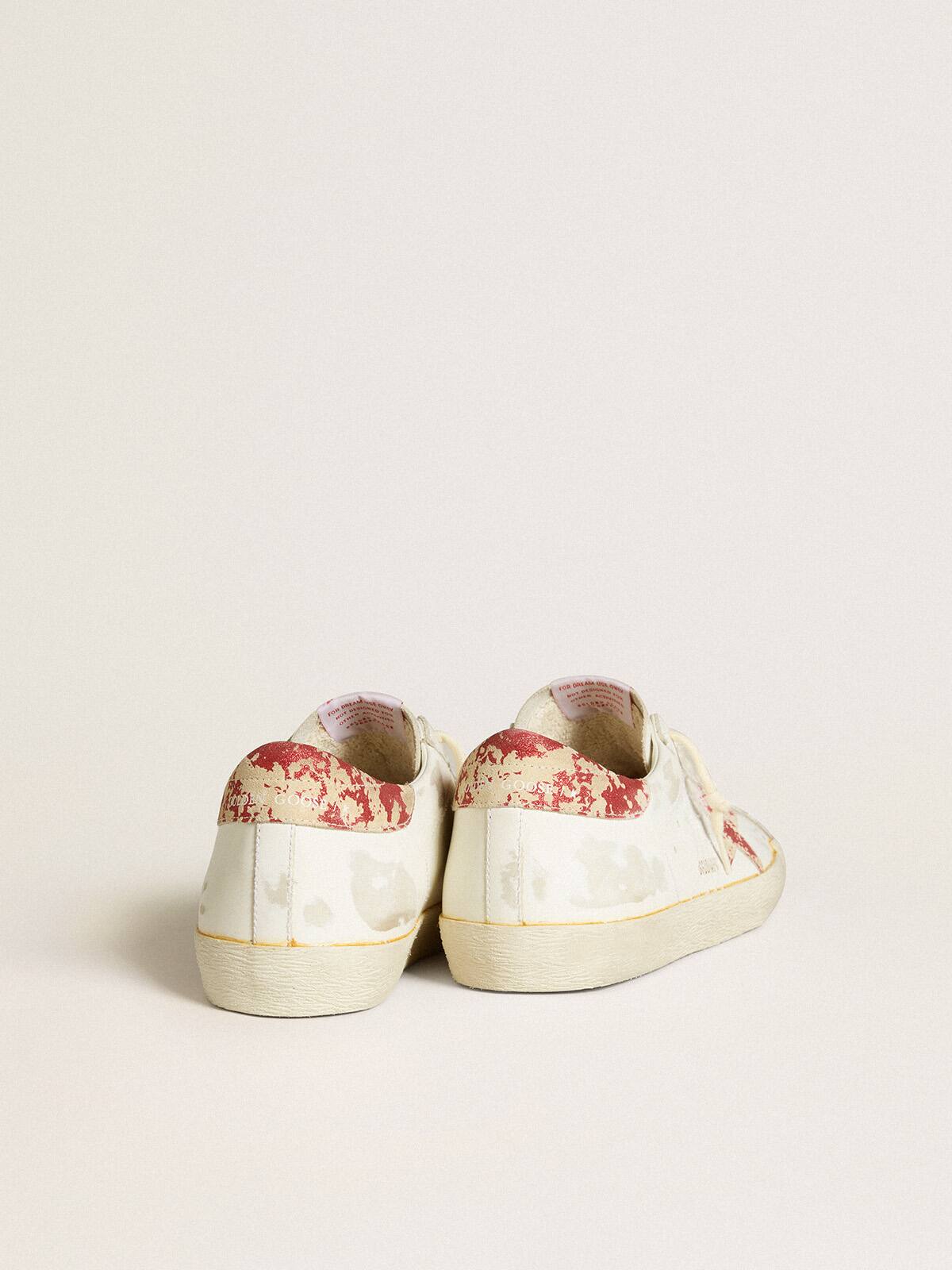 - Lengüeta del talón de ante blanco desgastado con pulverizaciones rojas