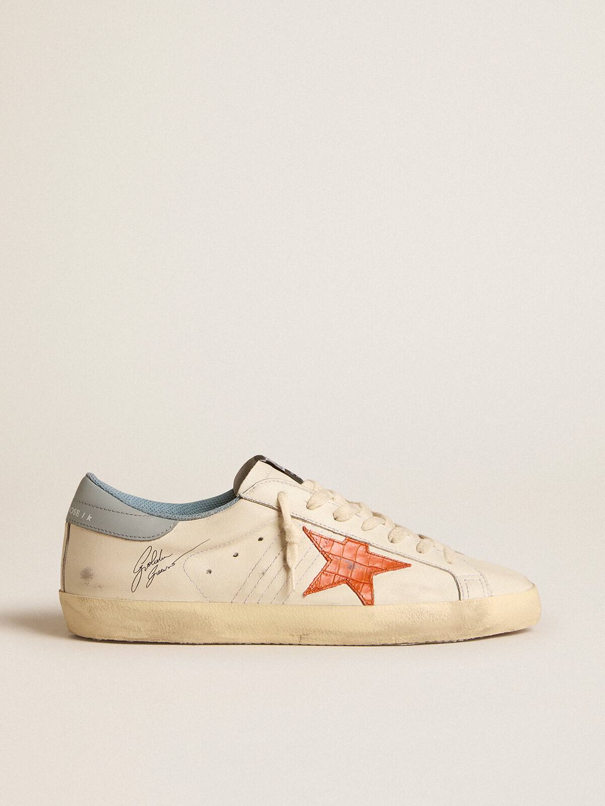 Un ícono atemporal pero que está en constante evolución. En Golden, nos encanta tomar nuestros clásicos y reinventarlos todo el tiempo, siempre desde un nuevo ángulo. Estas Super-Star con una parte superior de cuero blanco presentan una estrella de cuero con estampado de cocodrilo naranja y una lengüeta de talón de cuero azul plateado. La firma contrastante de Golden Goose en la parte superior y los cordones blancos añaden el toque final.