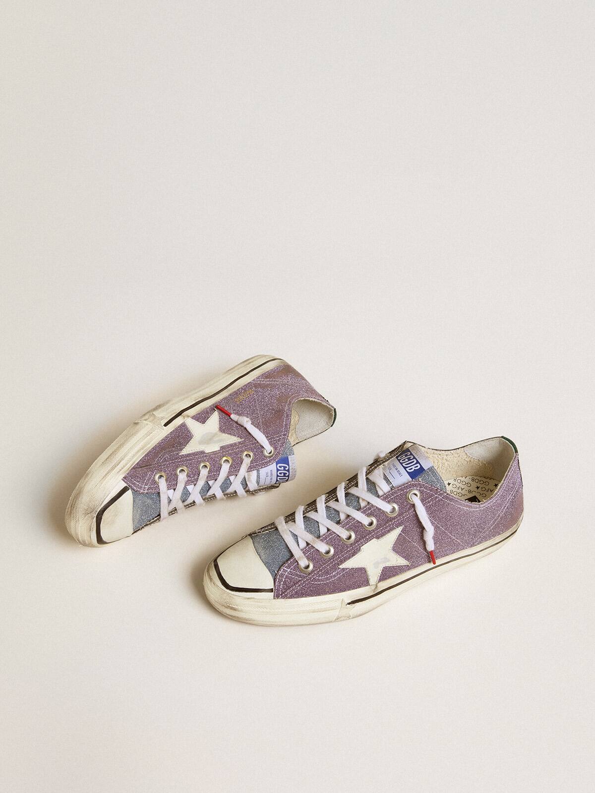 Belleza que reside en la simplicidad: en nuestras zapatillas V-Star, una forma esencial se encuentra con un detalle elegante. Este modelo LAB con parte superior de cuero lila y brillo presenta una estrella de cuero blanca y una lengüeta de brillo plateado. Y los cordones blancos con detalle rojo añaden el toque final.